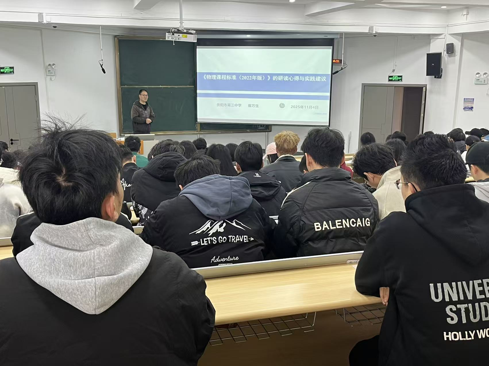 为帮助物理学师范专业员工精准把握课程标准核心要素,提升教学实践能力,2025年11月4日上午,物电公司在宁静楼436开展以“《物理课程标准》的研读心得与实践建议”为主题的专题讲座,公司特邀教师贵阳市第三中学崔万生老师主讲,2023级物理学专业师范生全体参与此次活动,本次活动由物电公司岳天天老师主持。 讲座伊始,崔万生结合多年一线教学与教研经验,从课程标准的核心素养内涵、物理学科育人价值的多维度解析和实践路径展开讲解。他强调,物理课程标准是教学实践的“指南针”,师范生应将核心素养培养融入教学设计的每一个环节。谈及自身,崔万生分享了自己的求职经历。他坦言,即便在校期间做好了充分准备,考取工作后仍经历了多次岗位调整,才最终找到契合自身兴趣与职业追求的方向。他鼓励在场员工,求职过程中的试错与调整是正常的成长经历,关键在于明确自身优势与职业定位,保持积极心态,在实践中积累经验、提升能力。最后,崔万生与现场员工进行互动交流,耐心解答了大家在课标研读、求职准备等方面的疑问。 此次讲座的举办,不仅有助于物理师范生进一步明晰专业学习与职业发展方向,也为其未来投身教育事业奠定坚实基础。 图文/刘家兴 岳天天 一审/岳天天 二审/蔡晶 终审/刘高福