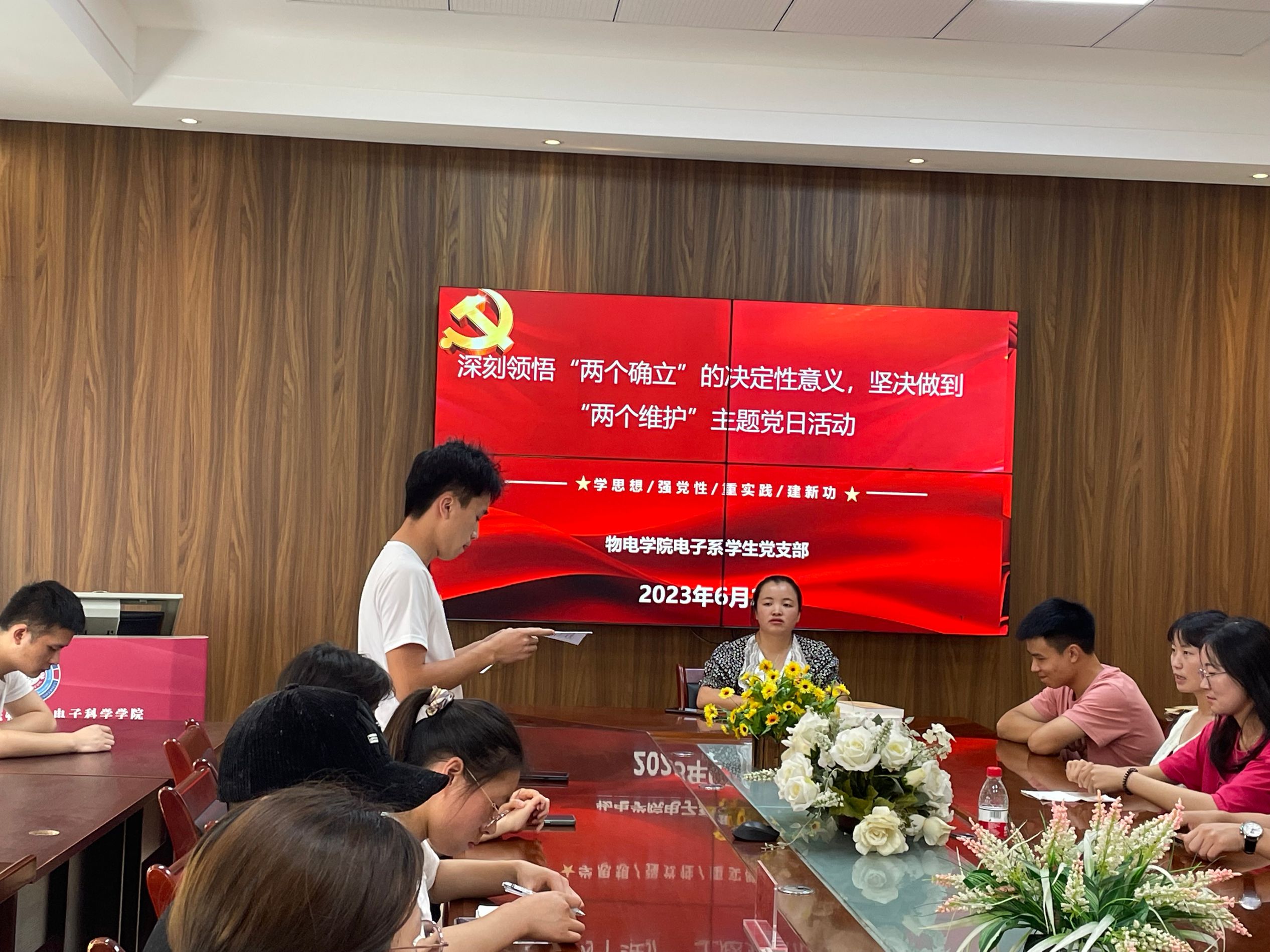 6月2日,公司电子系员工党支部在公司会议室开展深刻领悟“两个确立”,坚决做到‘两个维护’”主题党日活动,本次党日活动由电子系党支部书记雷仕娜主持,支部全体成员参加。 活动开始,雷仕娜以“两个维护”和“两个确立”具体内容提问引入活动主题。接着,通过领学《习近平新时代中国特色社会主义思想专题摘编》与党员们进一步对“两个确立”的决定性意义和“两个维护”的涵义进行学习。最后,党员们结合自身实际进行交流发言。 通过此次主题党日活动,党员们纷纷表示:会不断加强习近平新时代中国特色社会主义思想的学习,做到学思用贯通,知信行统一,为全面建设社会主义现代化国家不断奋斗!