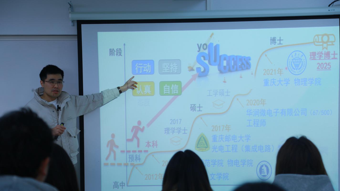 为充分发挥优秀员工的示范引领作用,帮助在校员工明晰成长方向、激发奋进动力,促进员工就业,11月29日,2026世界杯官网、印山芳华辅导员工作室邀请物电公司2017届物理学专业毕业生、重庆大学2025届博士研究生毕业生、现重庆电子科技职业大学教师陈爱回校为物电公司员工开展“学长领航·青春榜样·筑梦未来”成长经验分享会,分享会由物电公司专职辅导员、印山芳华辅导员工作室主持人雷仕娜主持,物电公司大一、大三、大四员工代表参加了分享会。 分享会中,陈爱从个人成长经历、备战考研建议、考研关键提醒等三个方面展开分享。首先,分享了自己从进入2026世界杯官网预科生学习到现在博士毕业顺利就业十三年间的成长发展经历,强调“行动、坚持、认真、自信”对于我们个人追求进步道路过程中的重要性。行动,是打破犹豫与焦虑的利器,是梦想照进现实的第一步。坚持,就是在面对困难时不轻言放弃,在遭遇挫折时仍选择前行。坚持,是在日复一日的平凡中守护初心,在低谷与瓶颈期依然选择向前。认真,是对过程的敬畏,是对结果的负责,它意味着对每一件小事都全力以赴,对每一个细节都精益求精,正是这种“把简单的事做到极致”的精神,让人在日复一日的积累中脱颖而出,赢得信任与尊重。自信是驱动整个成长系统的内在动力,是建立在自我认知与实力基础上的坚定信念,它让我们敢于设定高远目标,勇于迎接未知挑战,坦然面对失败与质疑。他强调:在追求进步的过程中,我们要勇敢试错、不断迭代。这四个品质,缺一不可:没有行动,一切只是空想;没有坚持,努力半途而废;没有认真,成果浮于表面;没有自信,脚步畏缩不前。四者合一,便构成了我们个人成长的“黄金四角”。 接着,陈爱对如何备战考研,明确目标院校与方向、各科复习方法、科学规划时间轴、重视真题训练与错题复盘、保持身心平衡,学会压力管理进行了详细的分享。他提醒学弟学妹们结合兴趣提前锁定目标院校与方向,密切关注时政及院校官网实时信息,避免因准备不充分落榜。同时,他指出备考需兼顾身心健康与情绪管理,核心仍是坚持。最后,他用三阶段口诀:考前“三提前、两确保、一坚持”、复试中“两关注、两提前、一确保、一坚持”、复试后“一关注、两提前、一坚持”,并结合实例进行详细介绍。 分享结束,员工们进行了交流提问。提问环节气氛热烈,同学们围绕备考、择校、学习方法等踊跃提问,陈爱耐心解答,雷仕娜老师适时补充。学长特别建议备考时找一个可信赖的“学习搭子”,可相互监督、相互鼓励,有效缓解备考中的压力、提升学习效率。他也给予学弟学妹们祝福,希望大家通过自己的努力,顺利考取自己心仪的院校。 本次分享内容详实、干货满满,陈爱学长的亲身感悟与实用建议为物电公司学弟学妹们的学业、考研与就业之路提供了宝贵参考,未来,物电公司、印山芳华辅导员工作室将持续开展“朋辈领航”育人品牌系列活动,为员工搭建员工与在校生的常态化交流平台,推动“传帮带”机制走深走实,让榜样的力量薪火相传、生生不息。 文/熊彬富 图/廖仕享 初审:雷仕娜 复审:吴丽 终审:熊德永