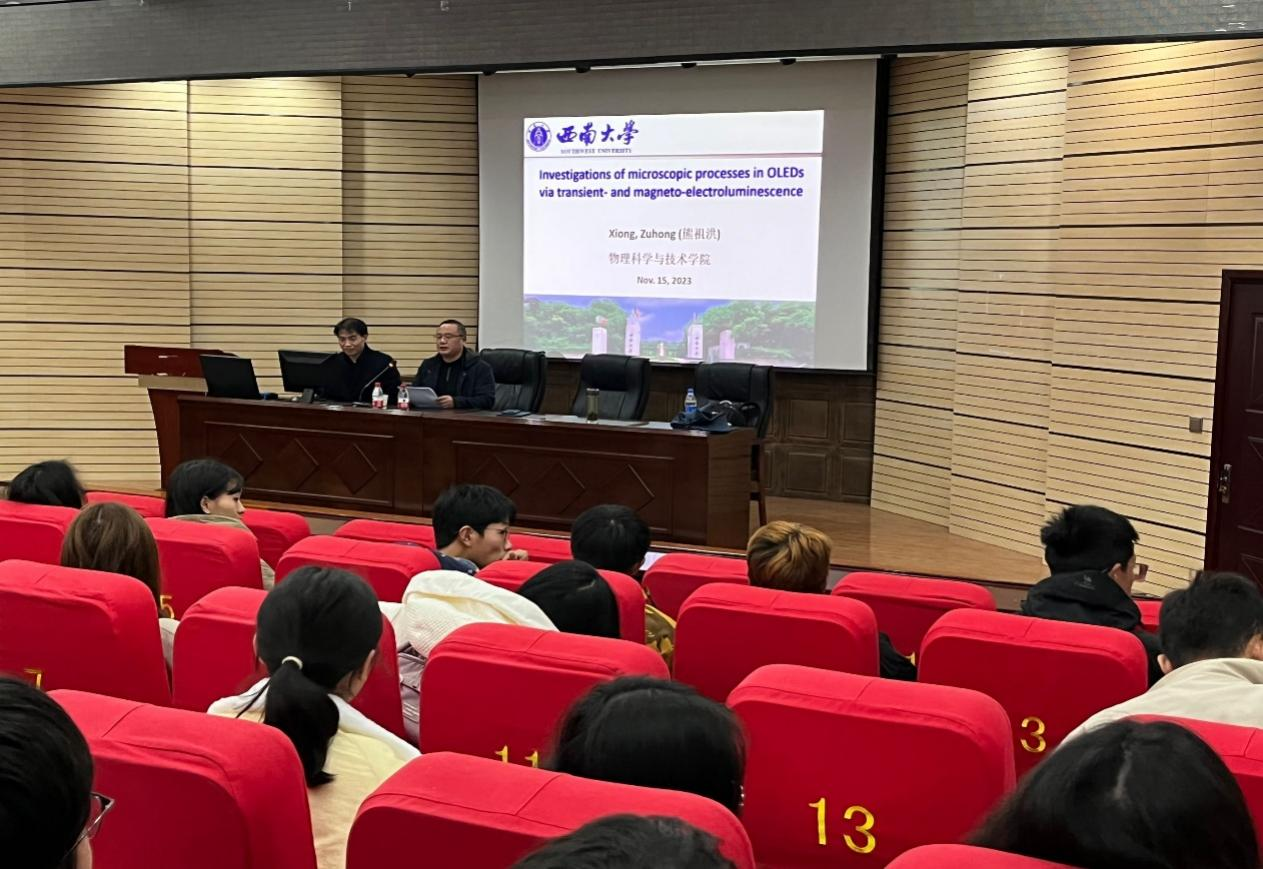 2023年11月15日上午,西南大学物理公司熊祖洪教授为公司师生展开了题为” 采用瞬态电致发光和发光磁效应研究OLEDs的微观演化机制”的学术讲座。其间熊教授对其课题组近年来通过磁效应(magneto-electroluminescence: MEL)和瞬态电致发光(transient electroluminescence: TEL)作为有机发光二极管(OLEDs)中发光中载流子和激子演化行为的探测工具取得的科研成果做出了深入浅出的介绍。并与在场师生开展热烈的学术讨论,同时对研究生选拔和培养等员工关注的问题做了详细的介绍。 · 讲座之后熊教授在公司会议室开展了2024年国基金申报指导活动。期间熊教授针对两位青年教师的科学研究问题展开了细致深入的交流,对今后的研究工作规划、研究困难的突破方法等方面提出了宝贵意见,并承诺后续可以按照需求进一步详细指导基金申报的具体内容,同时可以为后续的研究工作提供良好的条件支持以及合作空间。 通过此次学术交流工作,不仅使公司师生对有机发光二极管的基本机理上有了深刻的认识,拓展了了大家的科学视野,更是了解到科学研究对严谨工作态度的要求,同时对参会老师在今后基金申报工作中产生了积极的意义。讲座和会议均由公司陈德良副经理主持。